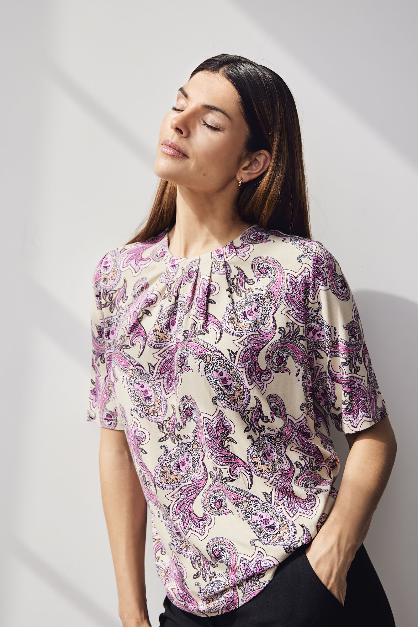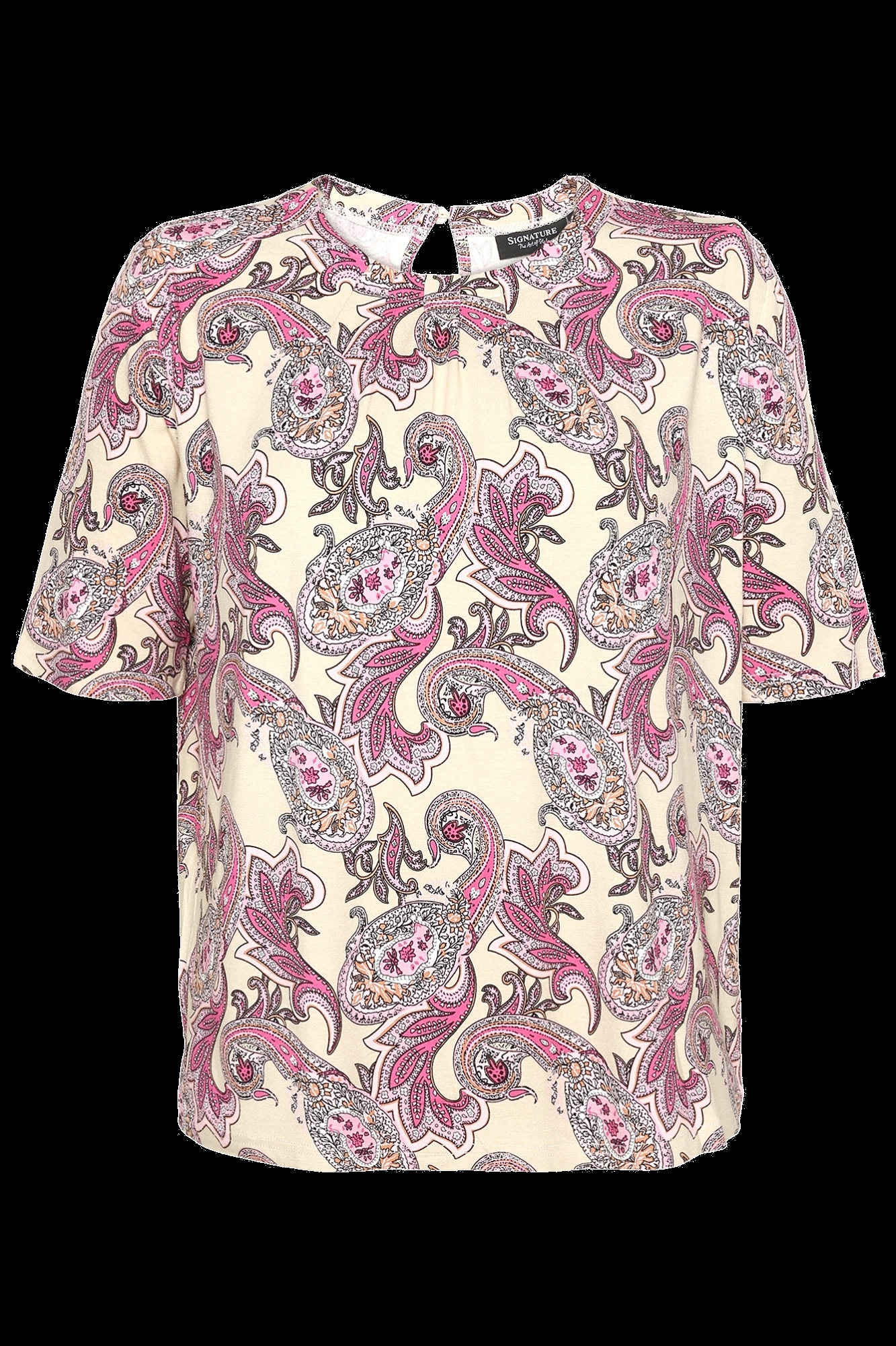 Giv din garderobe et feminint touch med denne stilfulde Brandtex bluse i et flot paisley-mønster i rosa og sandnuancer. Den lette kvalitet og behagelige pasform gør den ideel til både hverdagsbrug og mere elegante anledninger. Blusen har korte ærmer og en klassisk rund hals med en lille knaplukning i nakken, der giver et sofistikeret udtryk.