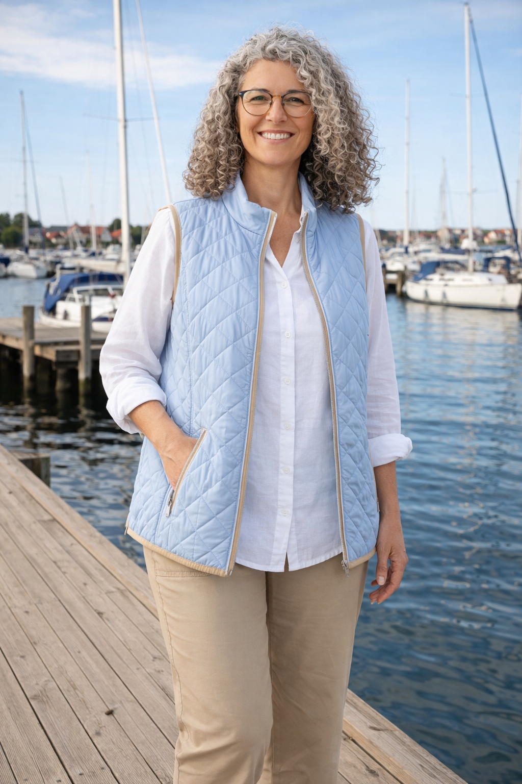 Den bløde vatterede damevest i sky blue fra Brandtex er et sikkert valg til dig, der ønsker en vest dame med både komfort og stil. Farven er rolig og tidløs, og det quiltede mønster giver vesten et eksklusivt og moderne udtryk. Den korte længde gør den oplagt til overgangsperioder og lag-på-lag outfits, og de praktiske lynlåslommer gør den funktionel i hverdagen. En quiltet vest dame som denne passer til både jeans og kjole, og er nem at style året rundt.