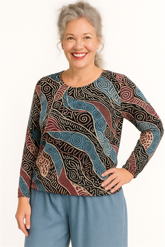 Smuk bluse fraGabrielle K  i blå og bourdeux toner med et mønster, som leder tankerne hen på flammer.