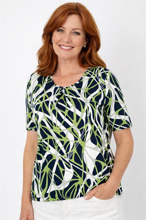 Gabrielle K T-shirt dame i hvidt/sort/grønt moderne mønster med korte ærmer