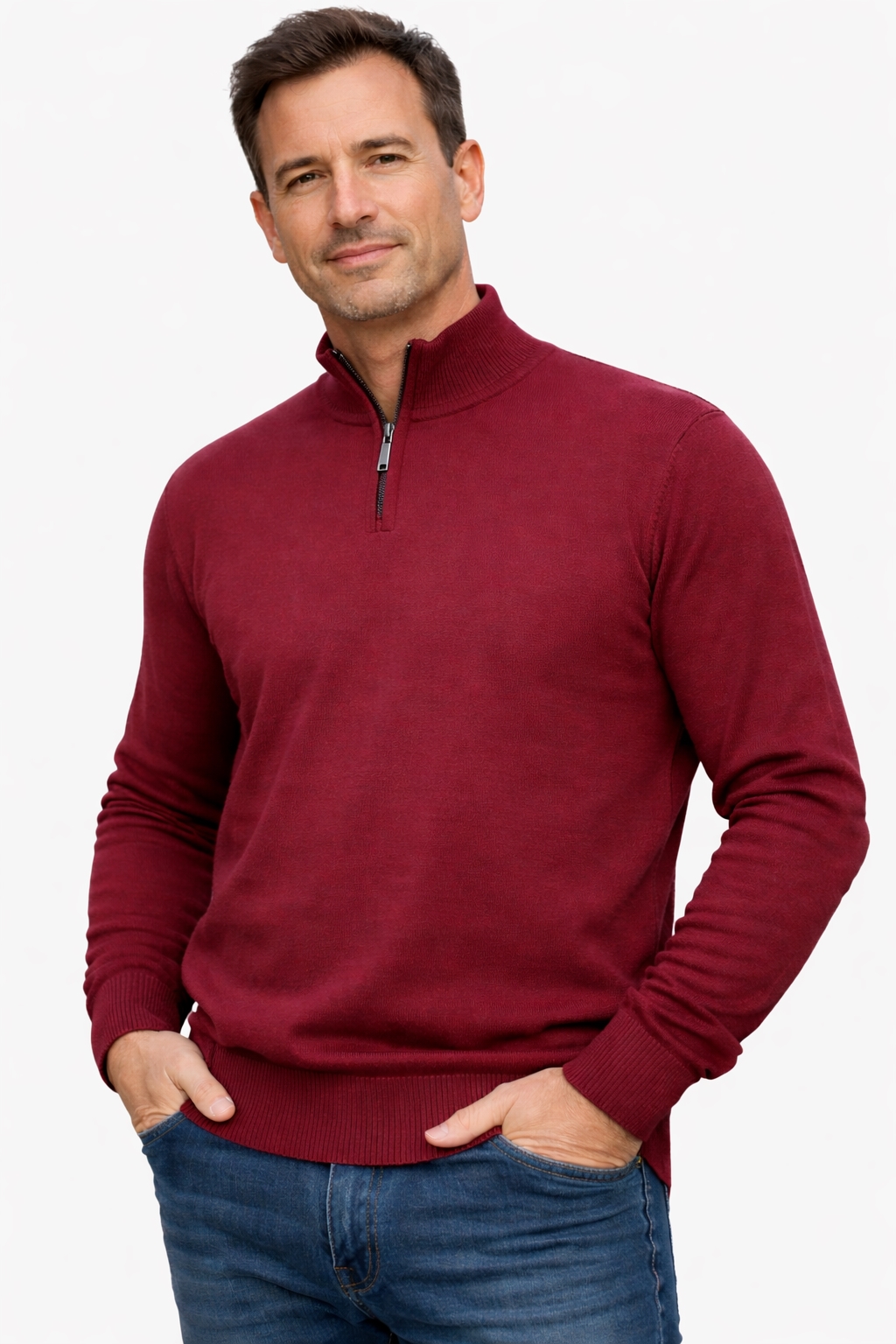 Herrestrik i let kvalitet vinrød med lynlås ved hals. Den passer til både sommer og vinter. Det er super lækker blød i kvaliteten og kan bruges både alene eller med en skjorte inden under.