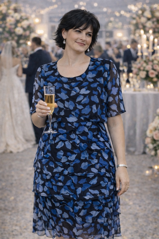 Brandtex festkjole chiffonstof i flotte blå farver.