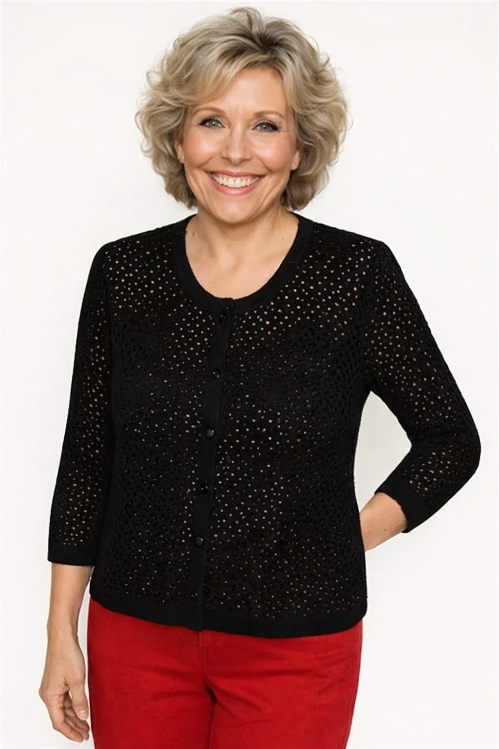 Bolero i sort fra Skovhuus med hulmønster, Kortærmet strik cardigan med hulmønster i strikken. Fin over både t-shirts og en fin kjole uden ærmer. Den bedste kvalitet fra danske Skovhuus.