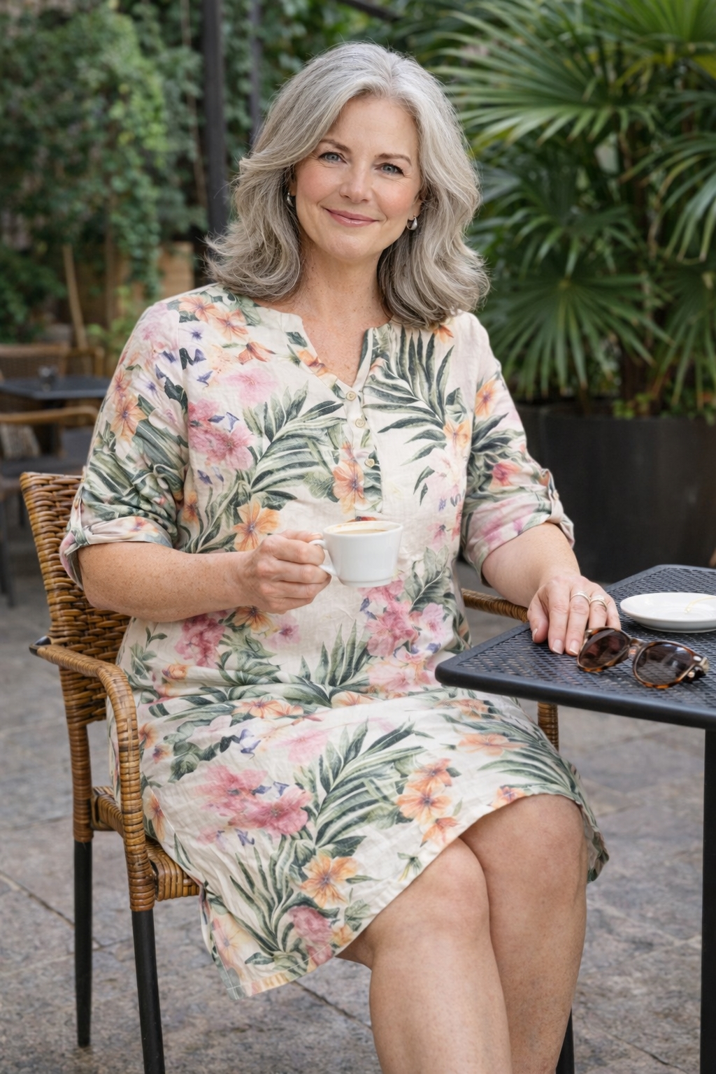 Lea H har skabt en smuk og anvendelig kjole til dig, der gerne vil føle dig velklædt uden at gå på kompromis med komforten. Denne kjole i hør er let og luftig – perfekt som sommerkjole til varme dage eller som lang tunika over et par leggings. Farverne i khaki og rosa giver et blødt, naturligt udtryk, der klæder de fleste hudtoner, og det florale print tilfører et feminint touch uden at blive for sødt. Pasformen er rummelig, så du kan bevæge dig frit – og den lille slids i halsudskæringen giver lige dét ekstra.