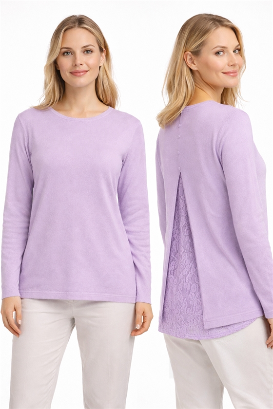 Striktrøje i lilla med rund halsudskæring og lange ærmer.