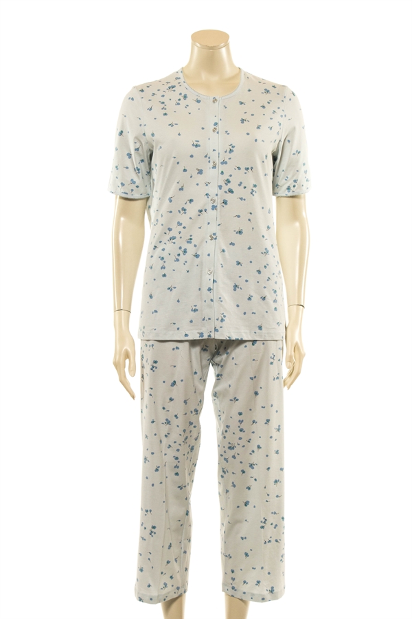 2-delt hyggesæt / pyjamas i lyseblå med blå blomster.