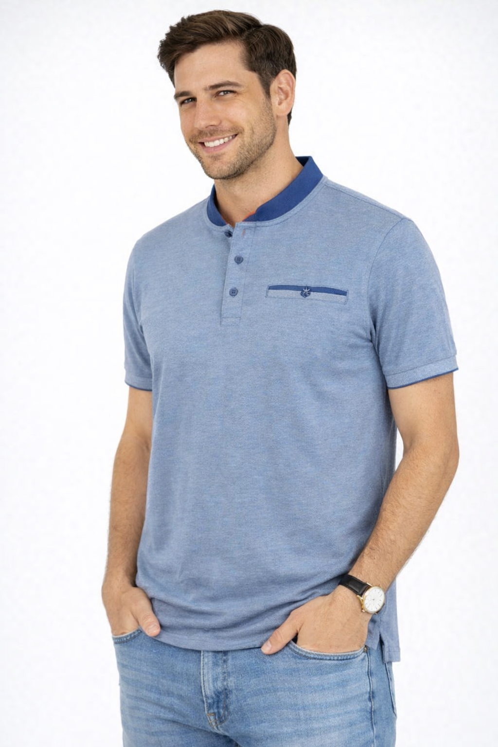 Herre polo i melleret blå med krave og brystlomme i flot mørkere blå.