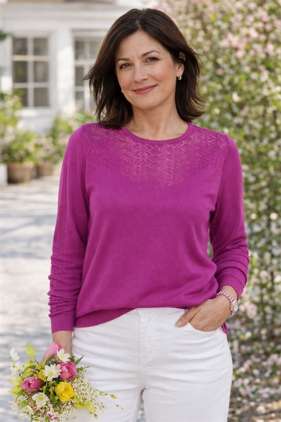 Micha Damestrik i ensfarvet lilla med fint hulmønster ved halsen