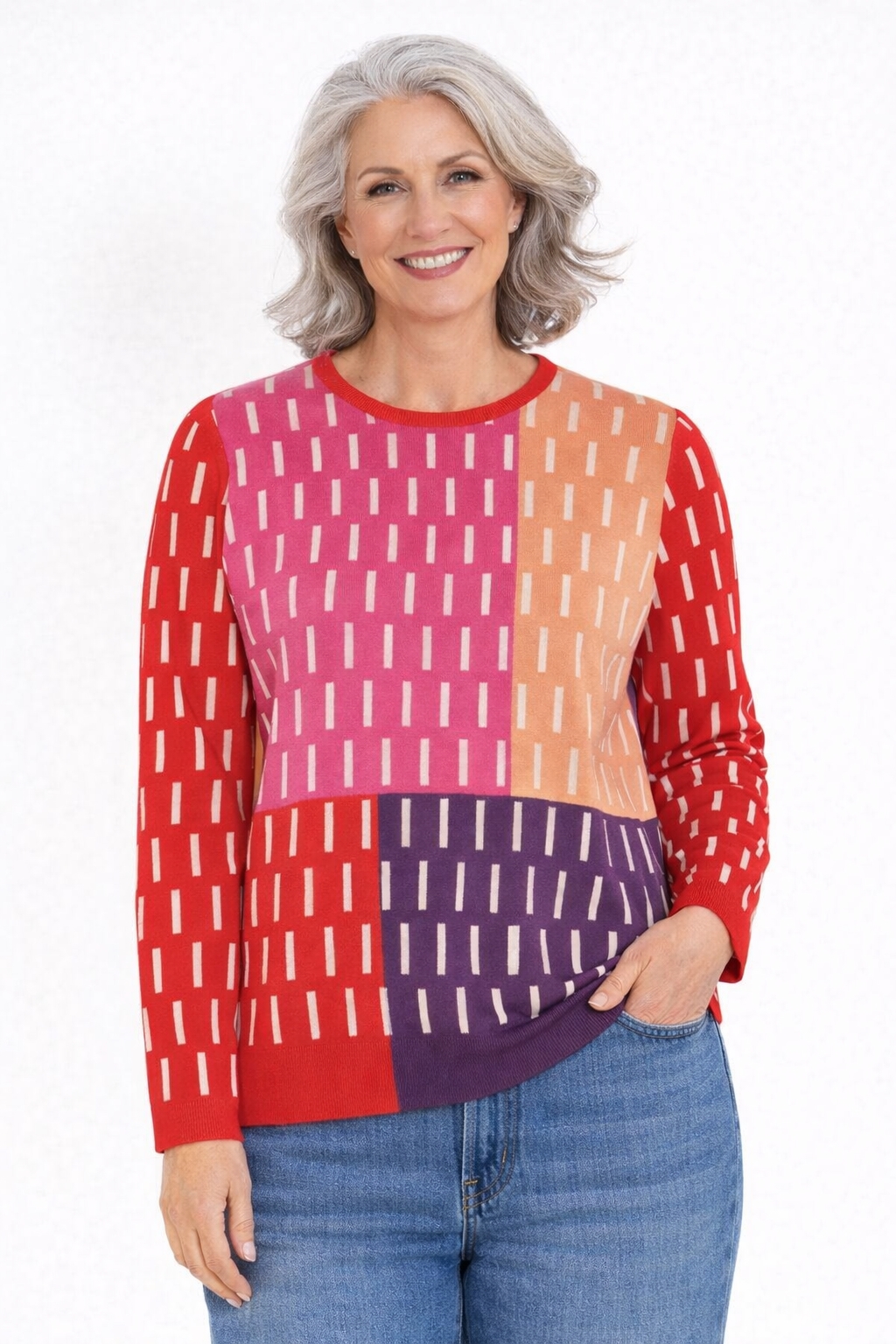 Strik bluser fra Micha i røde, rosa og lilla farver.