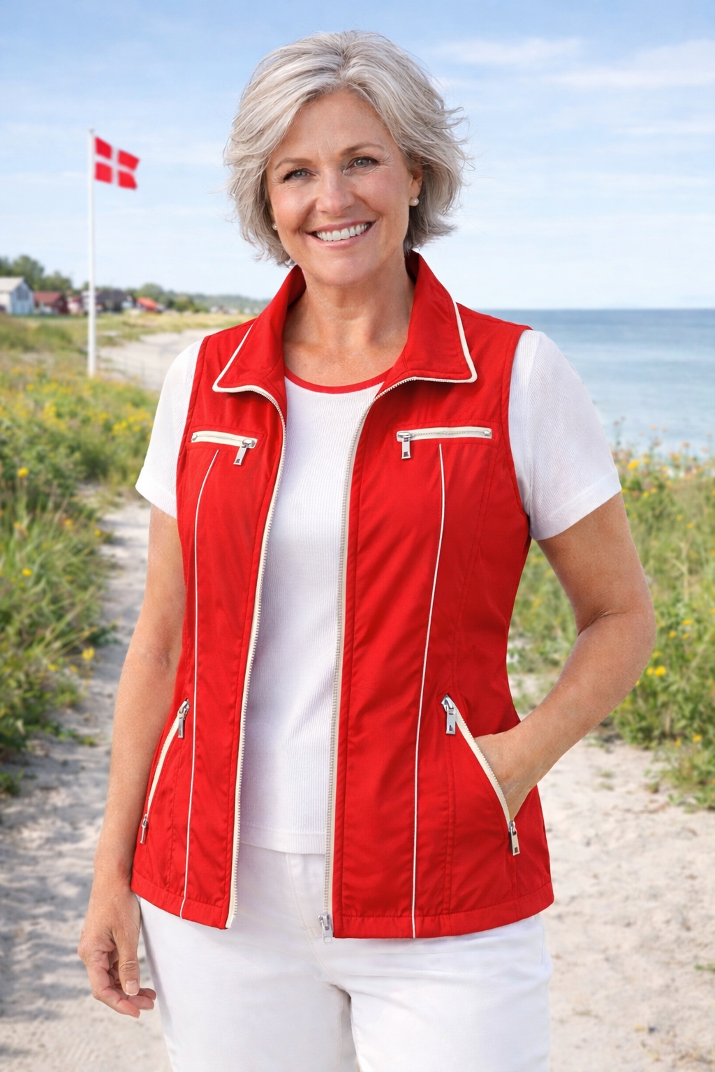 Micha vest i rød med smarte lynlås detaljer og hvid kontrast på krave