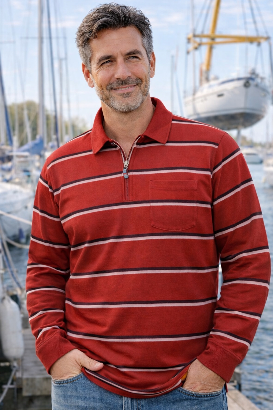 MXO herrepolo med lange ærmer i rødstribet - lynlås i halsen