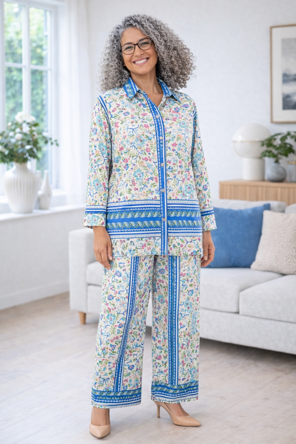 Tidløst Design og Uendelige Kombinationsmuligheder Det blå mønster tilfører et frisk pust til din garderobe og gør dette sæt til et blikfang, uanset hvor du går. Materialet i polyester sikrer, at sættet holder sin form og farve, selv efter gentagen brug og vask. Dette gør det ikke kun til en praktisk tilføjelse til din garderobe, men også en investering i din stil. Det matchende sæt dame er perfekt til enhver lejlighed, og kan kombineres i en uendelighed med dine favorit accessories for at skabe nye, spændende looks.