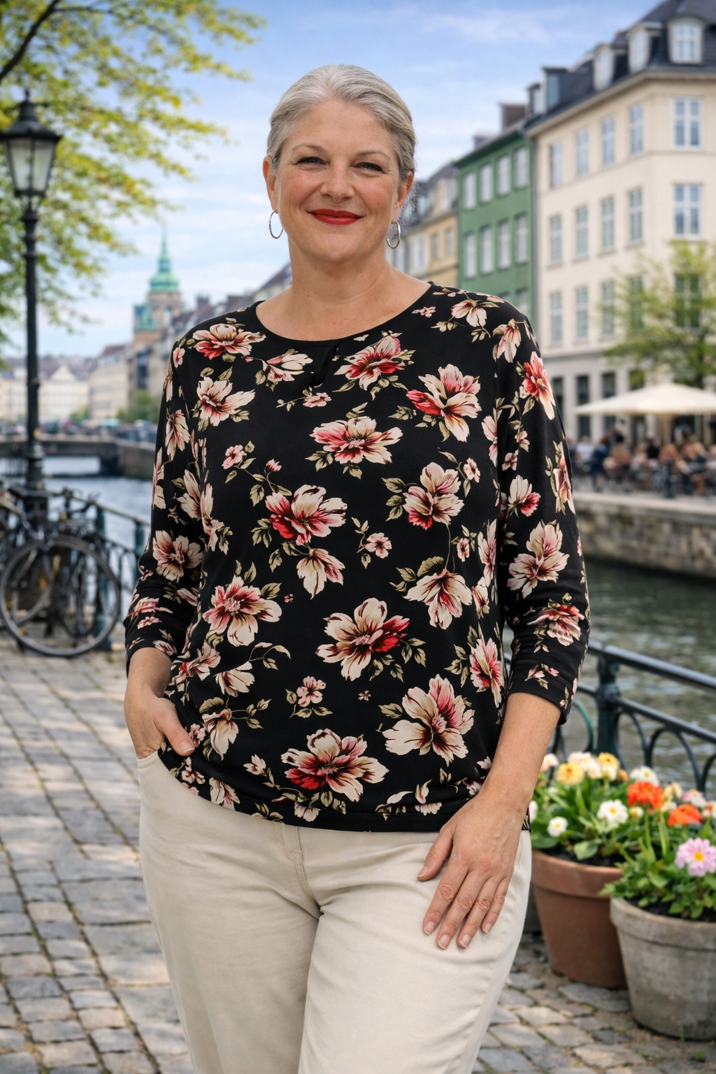 Sort let t-shirt med blomstermotiv foran og på ærmerne og en helt sort ryg.