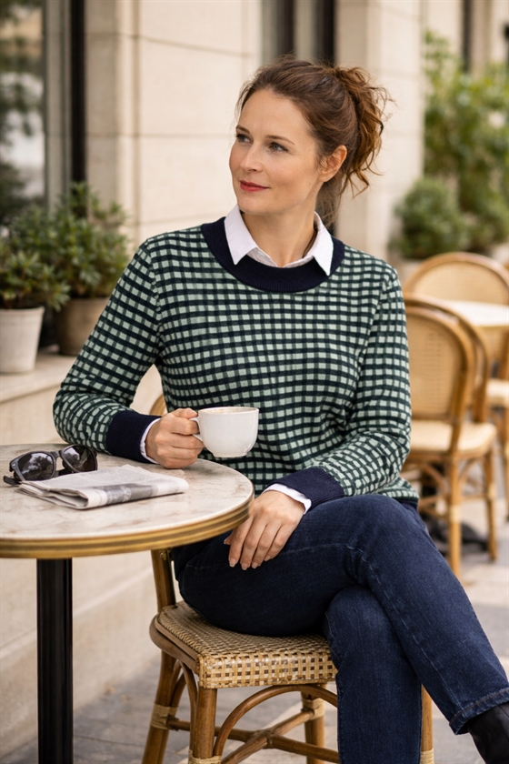 Strik bluse fra Skovhuus med rund halsudskæring og 3/4 ærmer samt flot struktur i strikken.